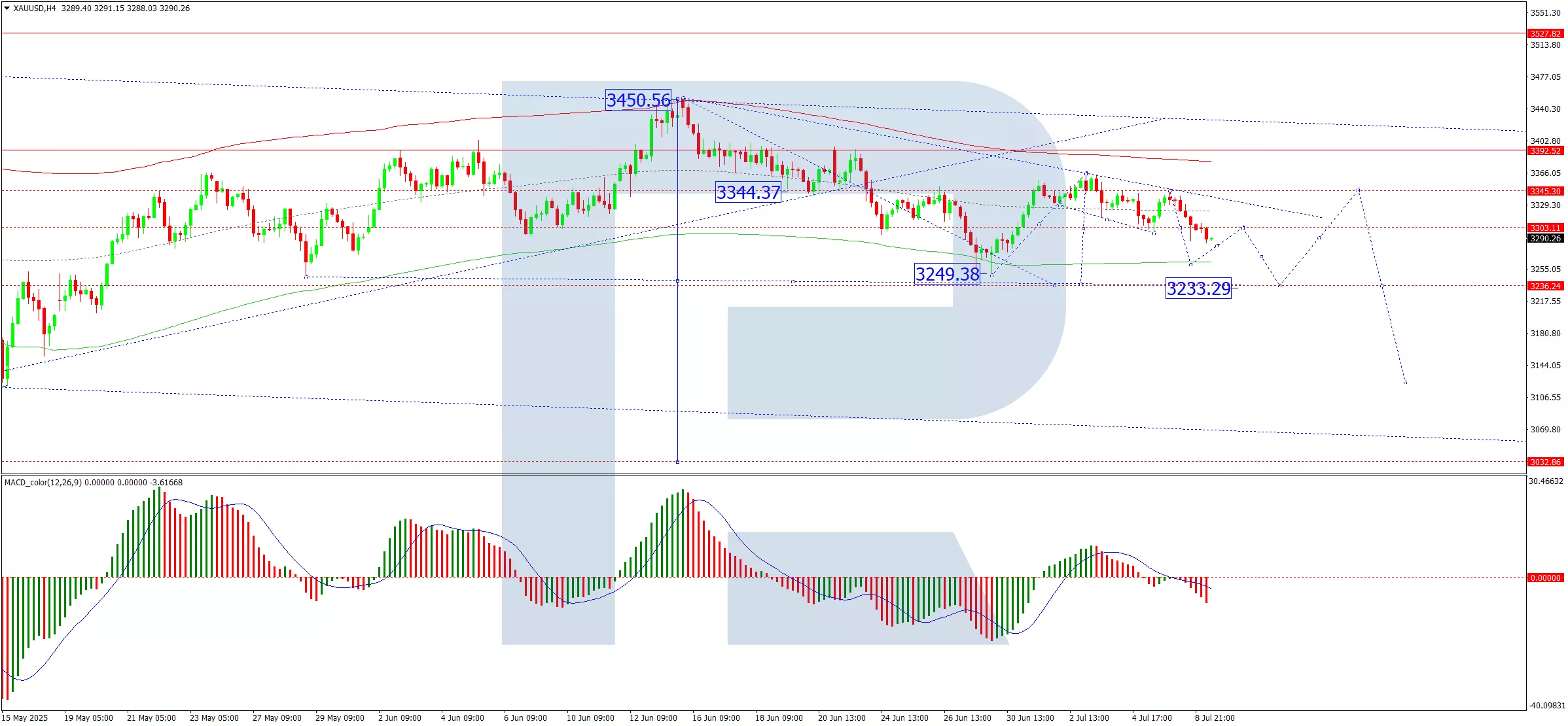 The XAU/USD pair is forming the fifth wave of a downward structure, targeting 3,233. Upon completion, a corrective wave towards 3,344 may follow before a potential resumption of declines to 3,121. This outlook is supported by the MACD indicator, whose signal line is below zero and trending sharply downward.