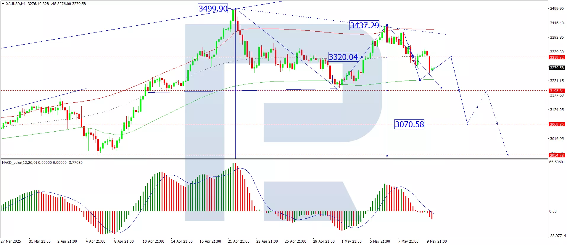 On the H4 chart, XAU/USD has formed a consolidation range around the 3,322 level. Today, we expect a possible decline to 3,195. After reaching this target, a correction to the 3,255 level is possible. Upon completing this correction, a new wave of decline to the local target of 3,070 may follow. Technically, this scenario is confirmed by the MACD indicator, as its signal line is below the zero level and is pointed decisively downwards.