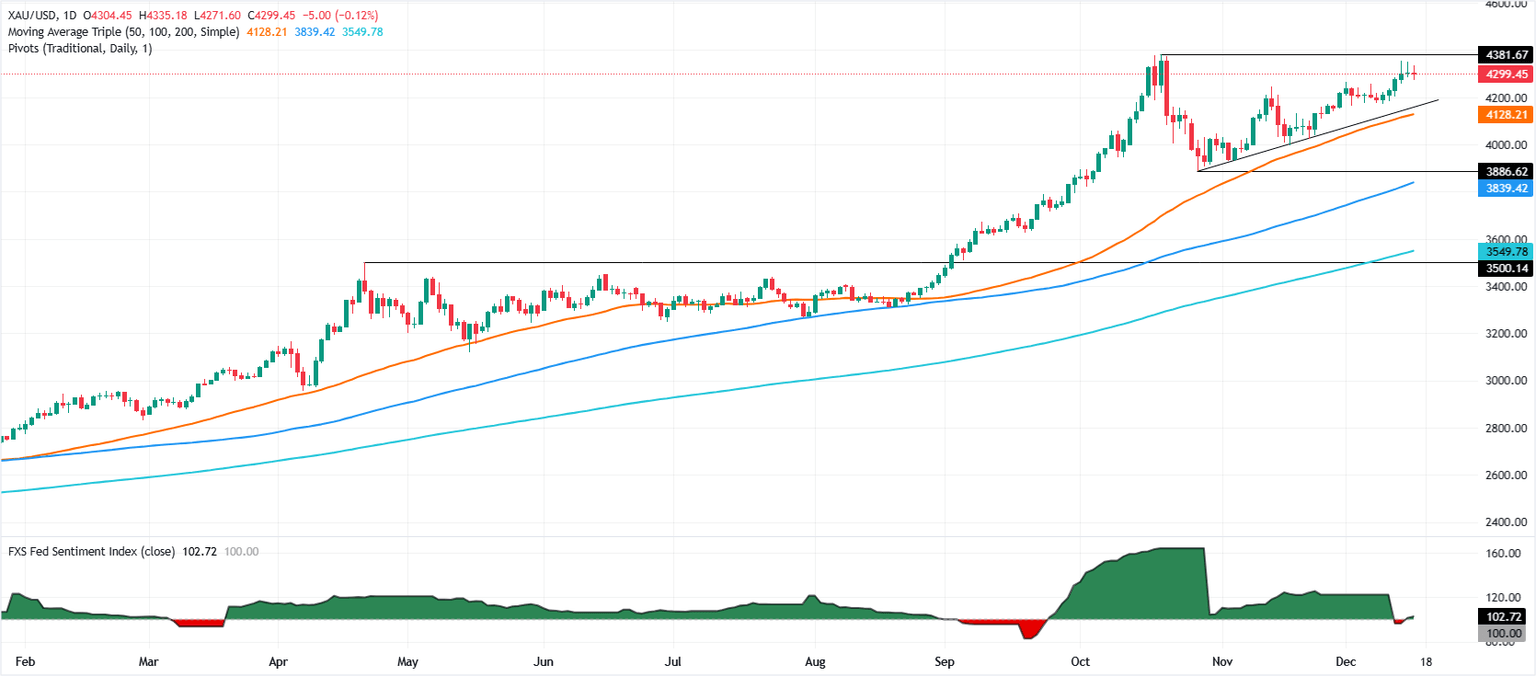 For a bullish continuation, XAU/USD must clear the December 12 high of $4,353. A breach of the latter will expose the all-time high (ATH) at $4,381, followed by $4,400, $4,450, and $4,500.