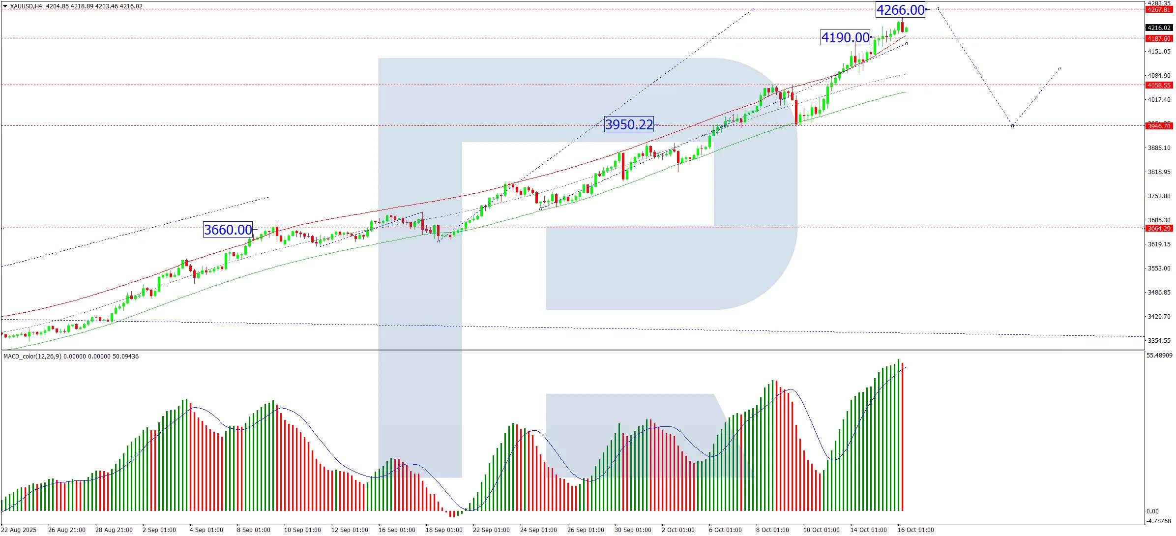 On the H4 chart, gold found strong support at 4,190 USD and is advancing towards an initial target of 4,266 USD. Upon reaching this level, a corrective pullback towards 4,100 USD is anticipated. Provided the broader bullish structure holds, this could establish a foundation for a subsequent upward wave, with potential targets at 4,300 – 4,400 USD. The MACD indicator corroborates this constructive outlook. Its signal line is firmly above zero and trending higher, confirming the current dominance of buyers.