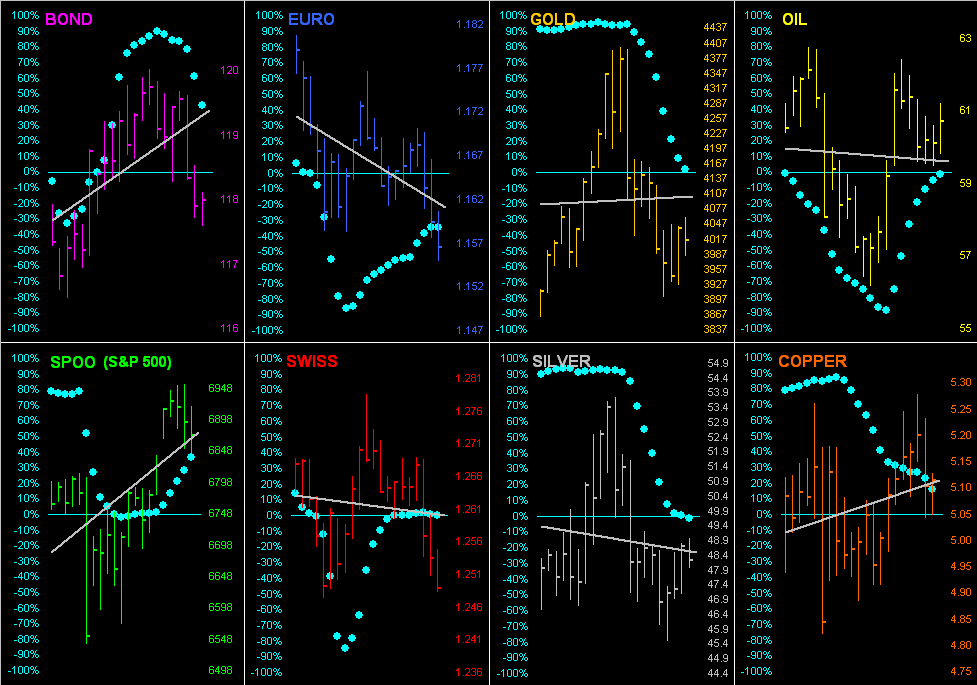 As to their travel from a month ago-to-date, here are those markets’ respective daily bars, grey regression trendlines, and beloved “Baby Blues”, the dots indicative of each trendline’s consistency. Of import (if given little FinMedia notice): the Dollar Index has risen five of the past seven weeks. Thus, we’ve the negative trendlines for both the Euro and Swiss Franc … and now for Sister Silver, too. Note that Gold’s trendline has all but rotated to negative, the “Baby Blues” in full cascade. Time to get a grip … else further dip!