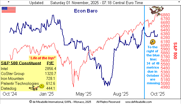 One can only wonder if StateSide “the top is in” for the economy as there is little data upon which to go. On Wednesday, the Federal Open Market Committee voted (not unanimously) to lower its Bank’s Funds Rate -25bp to the 3.75%-4.00% target range, even as the Policy Statement opened with “Available indicators suggest that economic activity has been expanding at a moderate pace.” Available, indeed: given the “shutdown”, only 15 of the 49 metrics due for the Economic Barometer during October arrived. And of those 15, just six improved period-over-period. There’s your “moderate pace”, baby. Too, there’s the S&P 500: is “the top in” there? Note our table in the Econ Baro of those constituents priced (given almost no earnings) beyond all sensibility. Better queried: “Have we crashed yet??” Here’s the Baro: