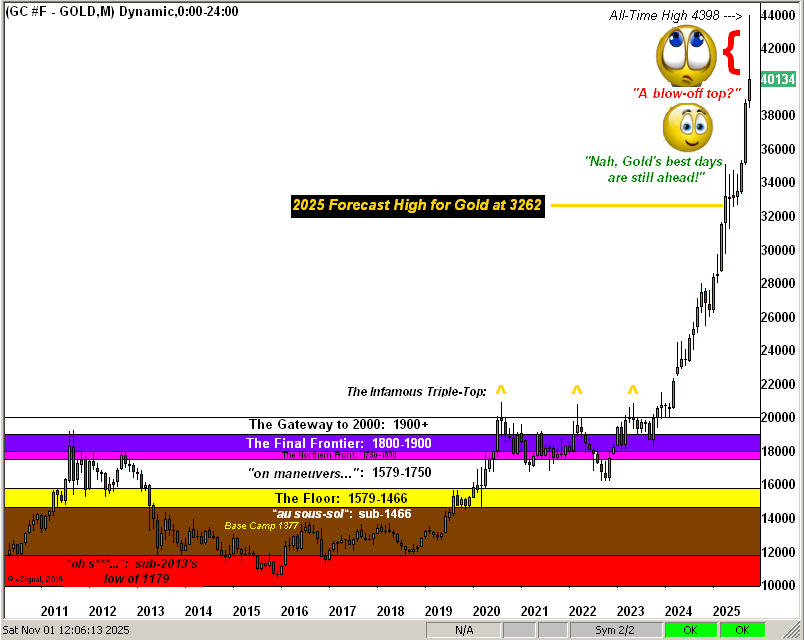 ‘Course it being month-end, we’ve next the Gold Structure graphic of price’s monthly bars from the year 2010-to-date. The lower areas of the chart still display the many stratified price areas through which we arduously struggled with Gold until finally, just two years ago, “The Infamous Triple Top” was broken, Gold having then been off to the races ever since. The third of those three tops was 2085 on 04 May 2023, from which to the present All-Time High of 4398 is a gain of +111% in just 2 1/2 years. As doubtless (barring a deflationary depression) Gold never again shall trade sub-2000, we’re “considering” future versions of this graphic to not extend back past the year 2020. Still, those older areas are an amazing reminder of what was endured and then how far we’ve come. As for “The Now”, the rightmost red-braced “failure candle” (October) is exemplary of what happens when — again — suddenly everyone’s a Gold expert, (which for you WestPalmBeachers suggests “The top is in!” … but more broadly, we doubt it):