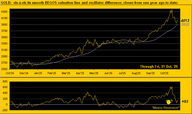 Amplifying the precious metals having pulled back from the highs of two weeks ago are the associated equities. Gold’s All-Time Closing High back on 20 October at 4374 has since fallen -8.3% to the current 4013 level. However, every equity product in the following graphic has exceeded that pace of pullback, ranging from -9.0% to -14.7%. As we on occasion quip: “Live by the leverage, die by the leverage”. Clearly, the amplitude of the chart’s Gold line is mild vis-à-vis those of the equities. Regardless, year-over-over the overall performances remain remarkable. Therein, Franco-Nevada (FNV) is +36%, Pan American Silver (PAAS) +41%, Gold itself +43%, the Global X Silver Miners exchange-traded fund (SIL) +59%, Newmont (NEM) +69%, the VanEck Vectors Gold Miners exchange-traded fund (GDX) +71%, and Agnico Eagle Mines (AEM) +81%: