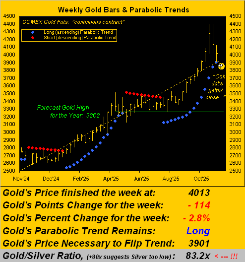 Dear Squire, price certainly can go on multi-week bearish runs. Recall during 2016 for the seven weeks ending 11 November through 23 December, Gold recorded net losses for all of them, preceded by a similar seven-week down stint during summer of 2015. Moreover, the last time Gold posted only three consecutive down weeks was almost exactly one year ago (those in 2024 ending 25 October through 15 November) … just in case you’re scoring at home. And (pun intended), Gold weakly finished this past week — yes, able to regain 4000 — but ’twas the lowest weekly settle of the past four.
