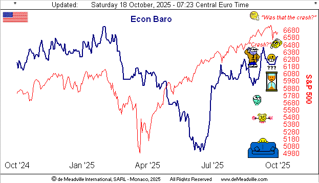 Unable to materially stray — due to the “shutdown” of the StateSide government — has been the Economic Barometer. From 01 October-to-date, there’ve been 32 scheduled metrics for the Baro … of which just nine have made the trip. Four so did this past week, amongst which three bettered their prior period: October’s New York State Empire and National Association of Homebuilders Indices, along with September’s Treasury Budget. The week’s sole loser was the Philly Fed Index for October. As for the 23 “missing links”, it remains to be seen (should the government ever reconvene) how they’ll affect the Baro’s scene. Until such time passes, here ’tis as is: