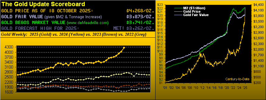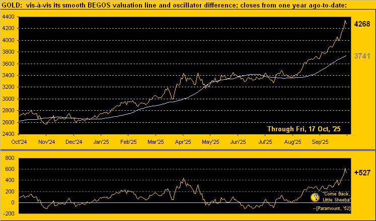 For Gold, yes, Squire, because it inevitably happens. In appraising Gold vis-à-vis its Market Value (wherein we assess price’s movement relative to those of the five primary BEGOS Markets, namely the Bond, Euro, Gold, Oil, and S&P 500), let’s turn to the following graphic. ‘Tis Gold’s daily closes from one year ago-to-date astride the smooth valuation line to which price always reverts per the oscillator (price less value) in the lower panel. And as depicted, Gold presently at 4268 is +527 points above that value (3741). As the valuation line itself is rising, the midpoint between the two is 4005, albeit pthe rice is subject to falling far faster than does the smooth line rise: