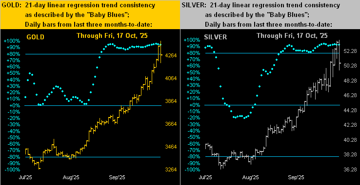 With respect to Gold potentially correcting at least over the near-term, the above graphic’s graveyard regardless reminds us that “Shorting Gold is a bad idea.” Still, let’s next assess the daily bars for the precious metals from three months ago-to-date, featuring Gold on the left and Silver on the right. In both cases, the baby blue dots of linear regression trend consistency have been housed above the key +80% axis for nearly six weeks, a firm indication of their sustained uptrends. However, as regular readers and website visitors know, upon the “Baby Blues” sinking below that level, lower prices likely are on the way. And with both metals closing well off their rightmost Friday highs, again a near-term top may be in place: