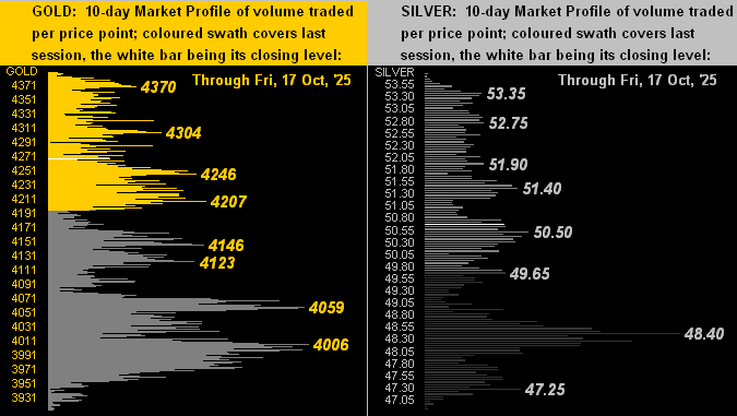 Too, by their respective 10-day Market Profiles for both Gold (below left) and Silver (below right), we can see the demise from Friday’s highs. By the labeled volume-dominant prices, Gold would appear to have a bit more underlying support than does Silver. ‘Tis not that rare a condition, especially should Silver couple up with Cousin Copper, whose own “Baby Blues” just confirmed a break below the +80% axis, (which you can view on the website). Thus shall Sweet Sister Silver discard for a time her precious metal pinstripes in exchange for her industrial metal jacket? She does on occasion stray that way… Here are the Profiles: