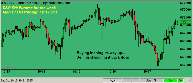 Toward wrapping, just a brief word on the S&P 500. ‘Tis Q3 Earnings Season, which so far (whilst still very early) is running well: 79% of the 39 reported constituents have beaten their Q3 of a year ago. Problematic is that the overall level of earnings remains unsupportive of the Index’s level (6664) given the honestly calculated price/earnings ratio (48.9x, the formula for which we’ve herein posted on numerous occasions). And per this next graphic of the past week’s S&P 500 Futures by the hour, the “inching-up buying” is being repetitively met with “slamming-down selling”. Thus, such word to you WestPalmBeachers down there we hope is sufficient: