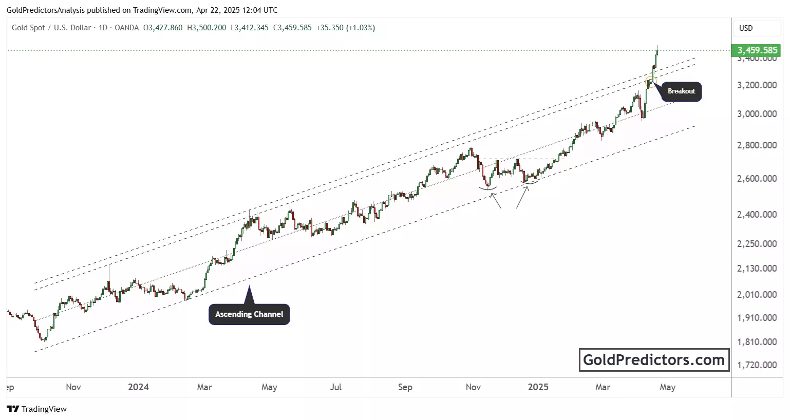 Gold’s breakout above a long-term ascending channel signals a major shift in market sentiment. With increasing global uncertainty and political tension in the U.S., investors are rushing toward safe-haven assets like gold. This bullish move is driven not only by technical patterns but also by fundamental pressures on the Federal Reserve and the broader U.S. economy. If the current environment continues, gold prices could reach new highs in the coming months.