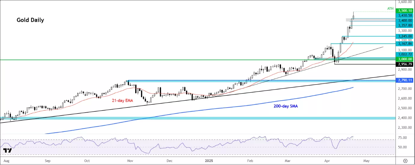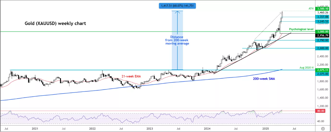 Gold has entered yet another uncharted territory, surging to a fresh all-time high of $3,500 today, before easing back somewhat. Since hitting a low of $2,956 earlier this month, it’s climbed nearly 18%—a hefty $540 move that’s been driven by a perfect storm of fundamental factors. Uncertainty in global markets, continued central bank buying, dollar weakness, and safe-haven demand are all playing their part. But as impressive as this rally is, investors are starting to ask the inevitable: how much further can it really go? The trend is clearly positive, but the risk of a pullback is growing as momentum reaches increasingly overheated levels. Still, the metal remains in the “buy-the-dip” camp, so any short-term pullbacks should be viewed as a long-side opportunities, unless the trend completely reverses.