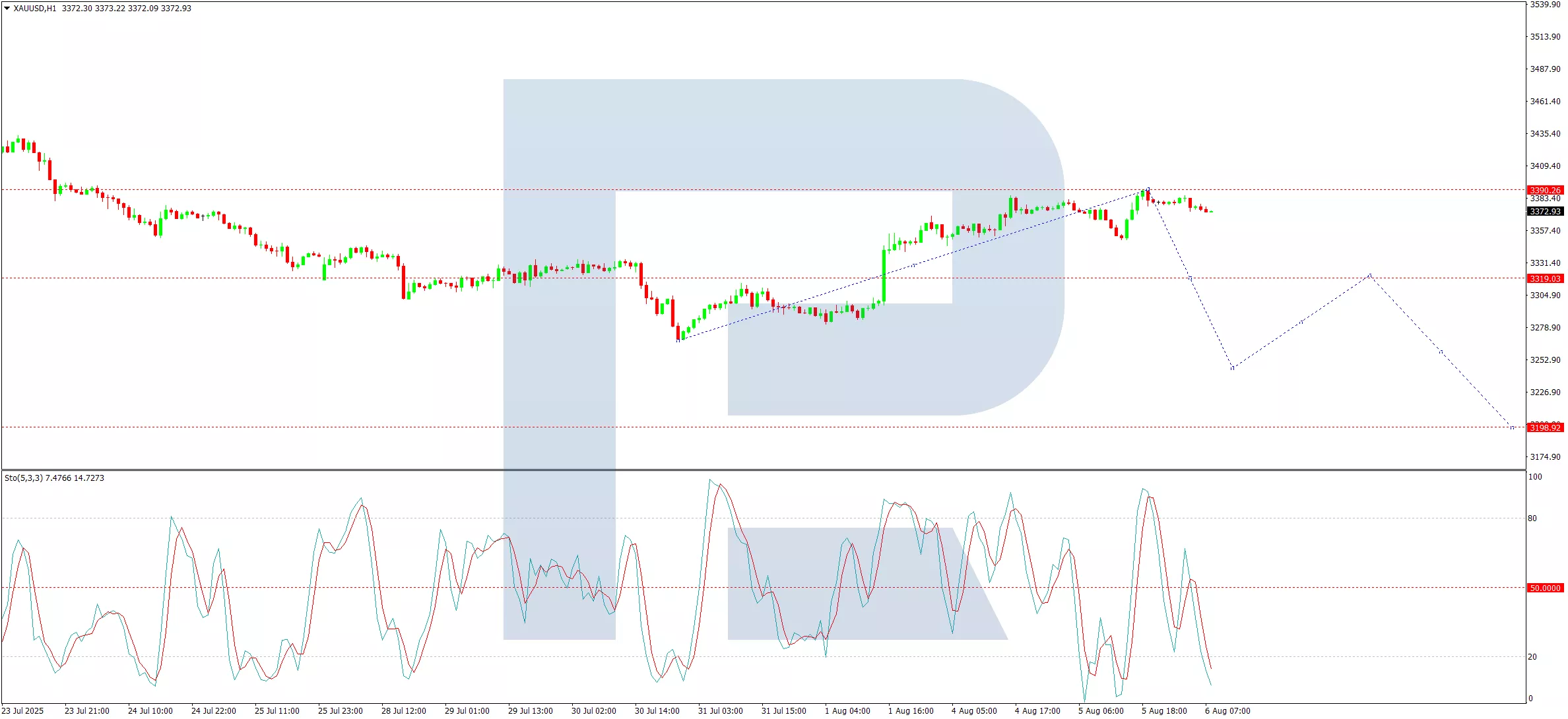 On the H1 chart, the market has completed a corrective structure to 3,390 USD. A consolidation range is now forming below this level, with a downward breakout likely to extend the decline towards 3,320 USD. A breach of this support could signal further downside momentum, potentially targeting 3,200 USD. The Stochastic oscillator corroborates this outlook, with its signal line below 50 and trending sharply downward towards 20.