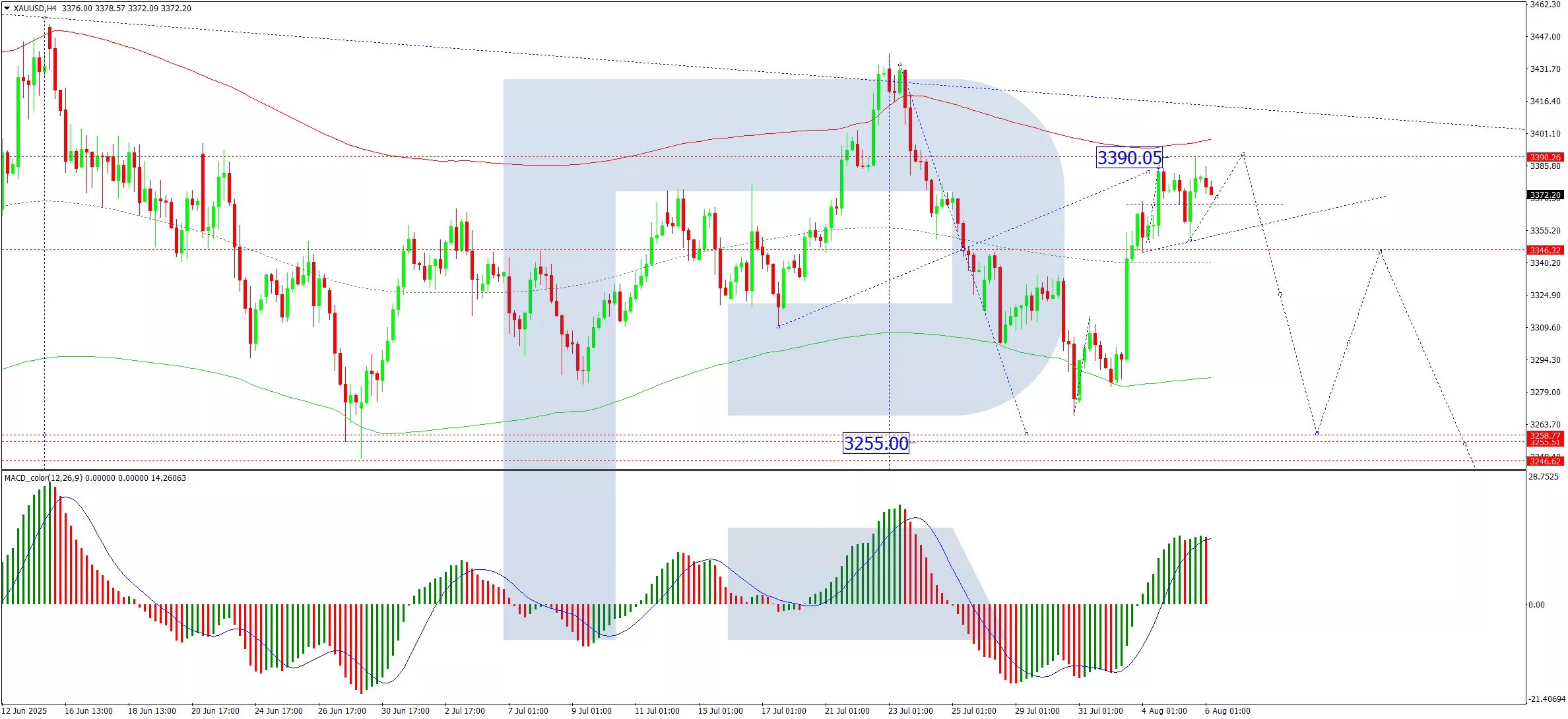 The XAU/USD pair is forming a broad consolidation range around 3,346 USD on the H4 chart. The market has corrected to 3,390 USD. Today, we assess the likelihood of a new downward wave developing towards 3,333 USD. A break below this level could extend the decline to a minimum of 3,255 USD. This scenario is technically supported by the MACD indicator, where the signal line remains above zero near recent highs but shows signs of an impending downturn.