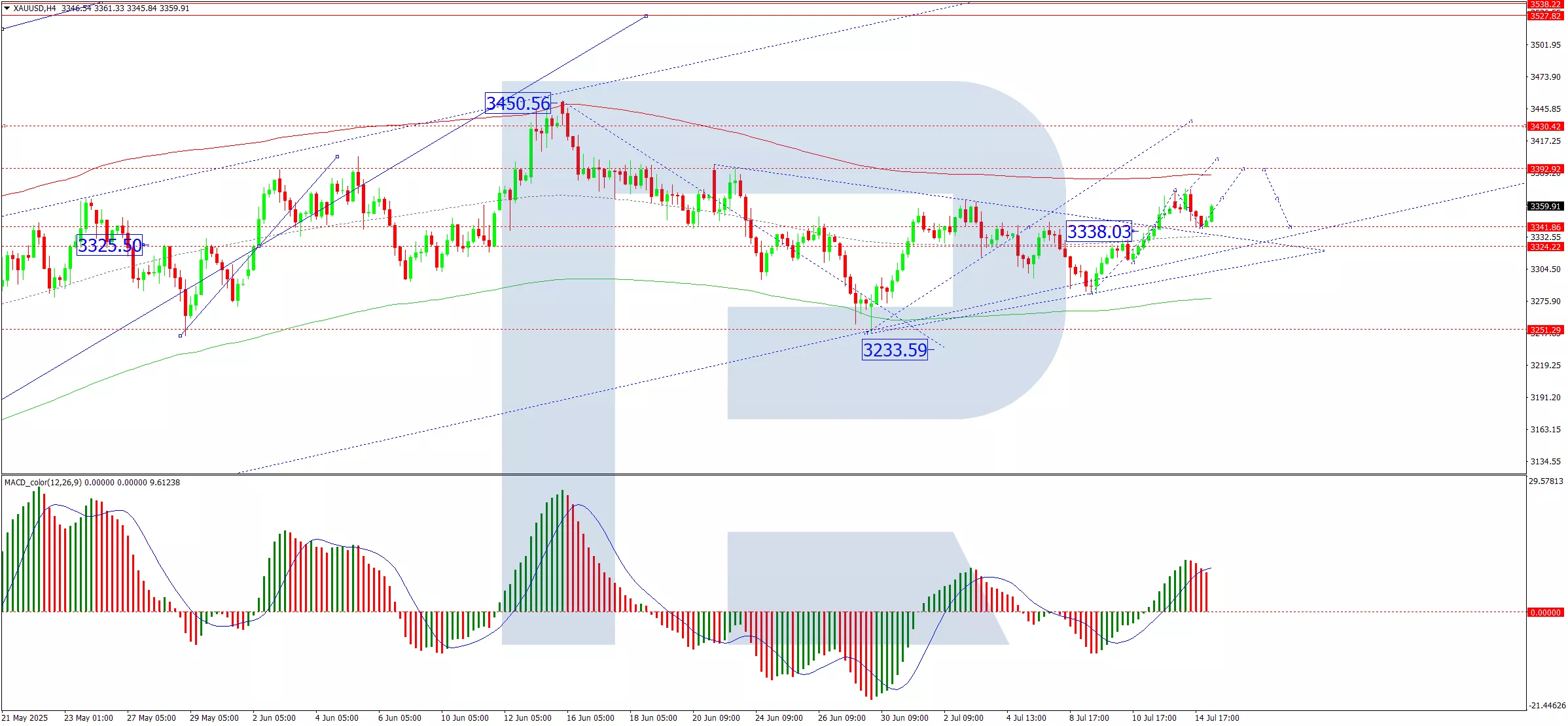 On the H4 chart, XAU/USD broke above the 3,340 level, hitting its local target of 3,373. Today, the market has seen a technical pullback to 3,340 (testing from above) before initiating a new upward wave towards 3,400. Once this wave concludes, we anticipate a corrective retracement to 3,340, followed by a potential further rise to 3,434. This scenario is supported by the MACD indicator, where the signal line remains above zero and pointing firmly upwards.