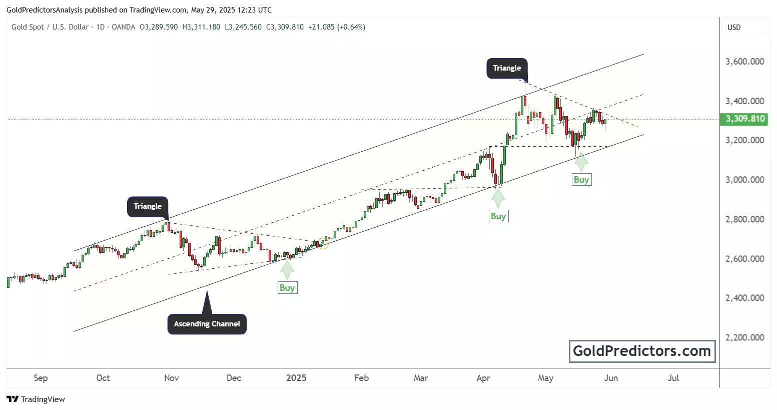 The chart marks three key “Buy” zones, each occurring at the lower boundary of the channel or after a triangle breakout. These zones provided excellent entry points for traders following the trend. Currently, gold appears to be trading near the middle of the channel, just above $3,300. A triangle pattern has formed again, signalling another potential breakout in the near term.