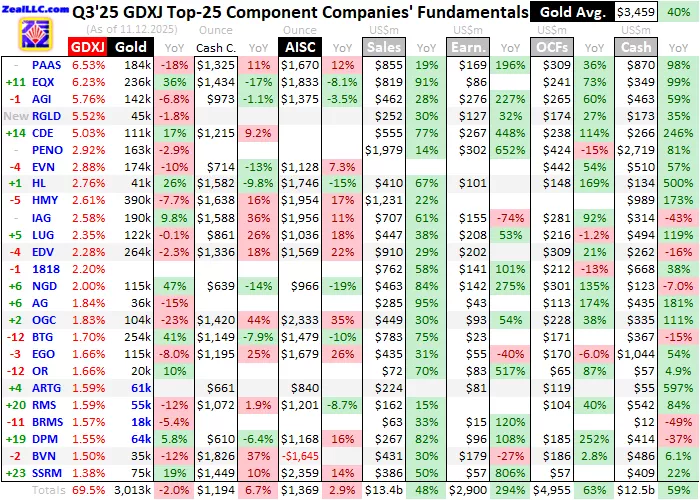This table summarizes the GDXJ top 25’s operational and financial highlights during Q3’25. These gold miners’ stock symbols aren’t all US listings, and are preceded by their rankings changes within GDXJ over this past year. The shuffling in their ETF weightings reflects shifting market caps, which reveal both outperformers and underperformers since Q3’24. Those symbols are followed by their recent GDXJ weightings.