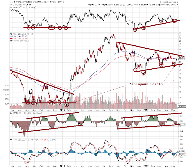 Here we have the two pennant formations compared. The first was the end of the long four years of decline, then we had the sharp climb in 2016, then we have had the limbo going into 2017. If this breaks to the upside, it will have been the classic continuation pattern with a new bull leg ensuing, continuing the 2016 move. The A/D (Accumulation/Distribution) and CMF (Chaikin Money Flow) cycling is very similar. In both formations, there was a positive switch trend in place in money flow, and we are at the takeoff point in that cycling.