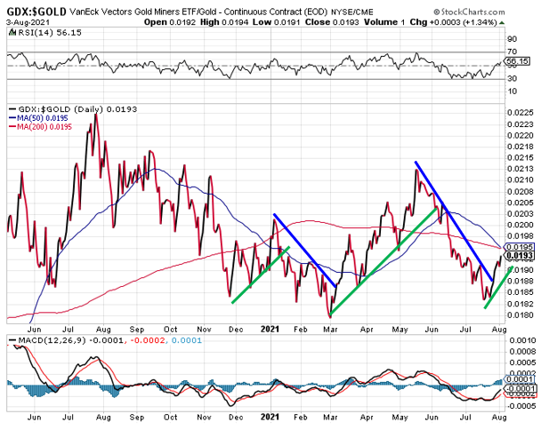 The following chart plots the VanEck Vectors Gold Miners ETF (NYSE: GDX) against the gold price. When gold stocks start outperforming gold, it suggests a new rally phase has begun.
