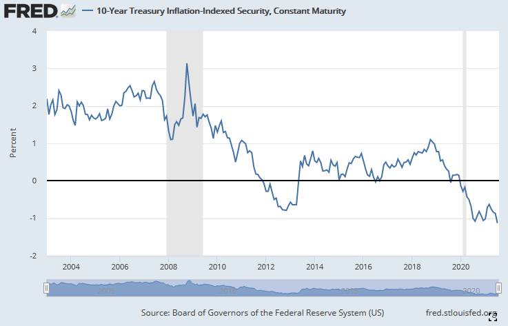 The 10-year inflation-adjusted yield is the most widely used indicator for real interest rates which, essentially is 10-year rates minus inflation. That’s the real return on an investment in a 10-year U.S. Treasury.