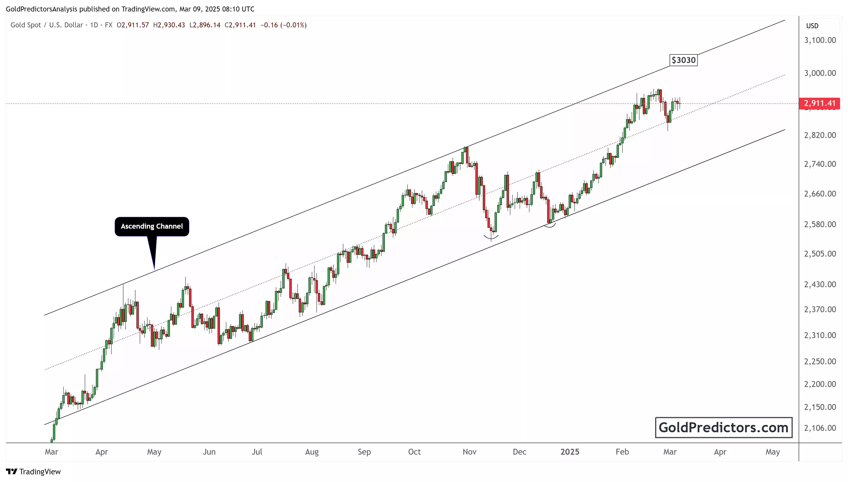 The gold price chart shows an ascending channel pattern, indicating a strong bullish trend. The price has consistently respected the channel’s support and resistance levels. Recent movements suggest that gold remains within the channel, with a potential target of $3,030 if the bullish momentum continues.