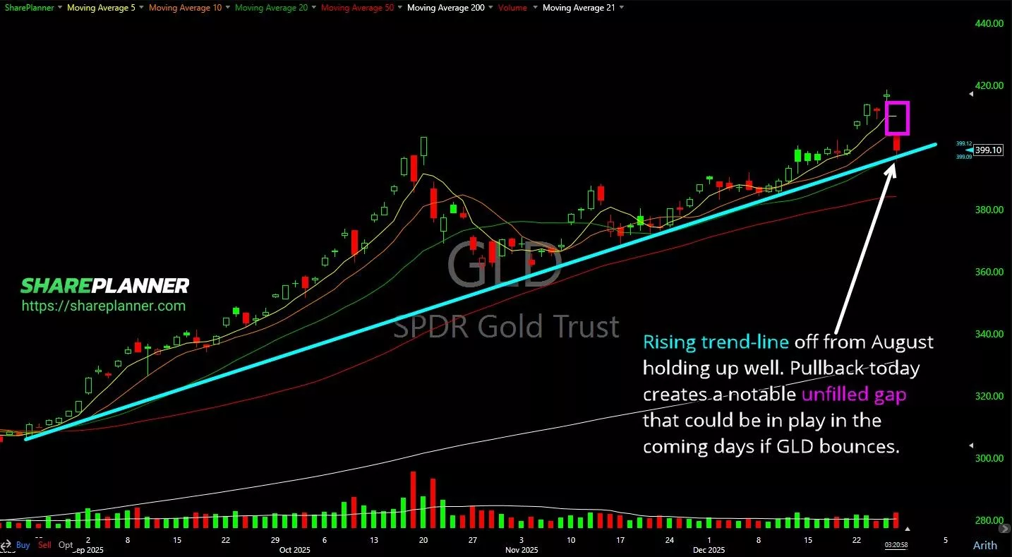 The Gold ETF (GLD) is pulling back to its rising trend-line and so far holding that level.