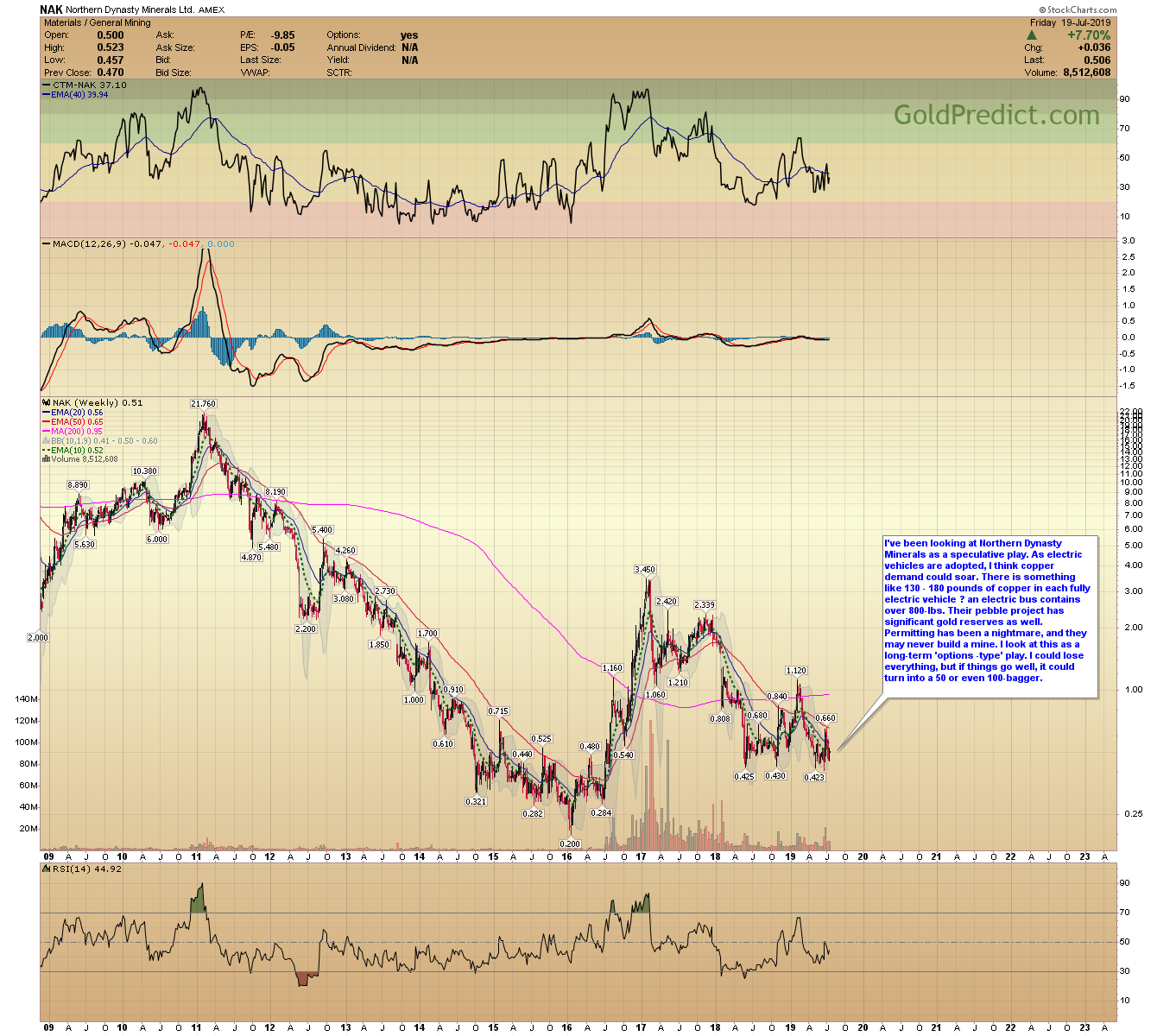 I’ve been looking at Northern Dynasty Minerals as a speculative play. As electric vehicles are adopted, I think copper demand could soar. There is something like 130 – 180 pounds of copper in each fully electric vehicle — an electric bus contains over 800-lbs. Their pebble project has significant gold reserves as well. Permitting has been a nightmare, and they may never build a mine. I look at this as a long-term ‘options -type’ play. I could lose everything, but if things go well, it could turn into a 50 or even 100-bagger.