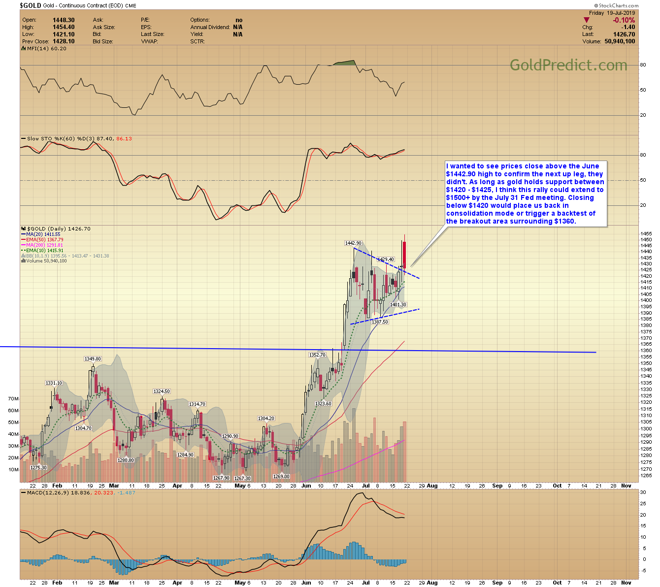 I wanted to see prices close above the June $1442.90 high to confirm the next up leg, they didn’t. As long as gold holds support between $1420 – $1425, I think this rally could extend to $1500+ by the July 31 Fed meeting. Closing below $1420 would place us back in consolidation mode or trigger a backtest of the breakout area surrounding $1360.