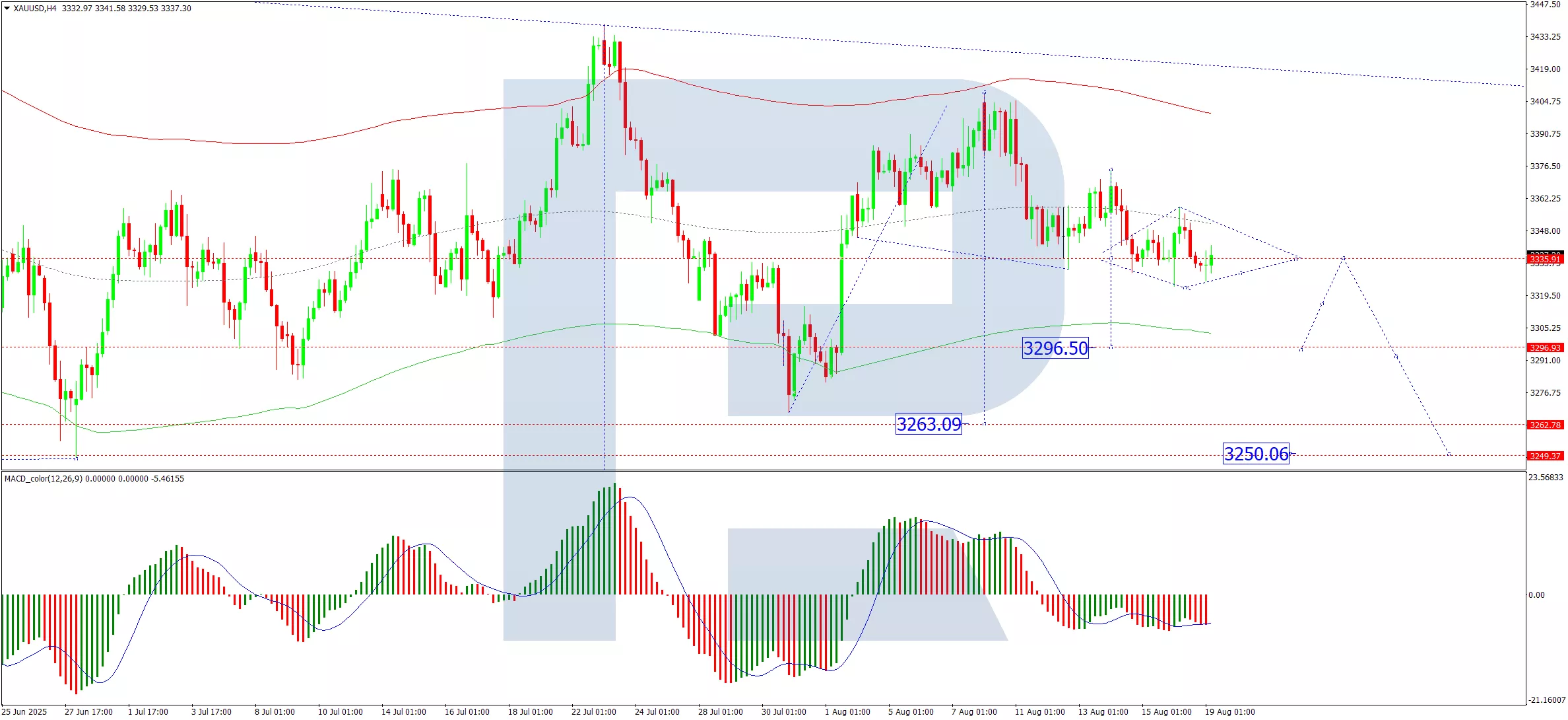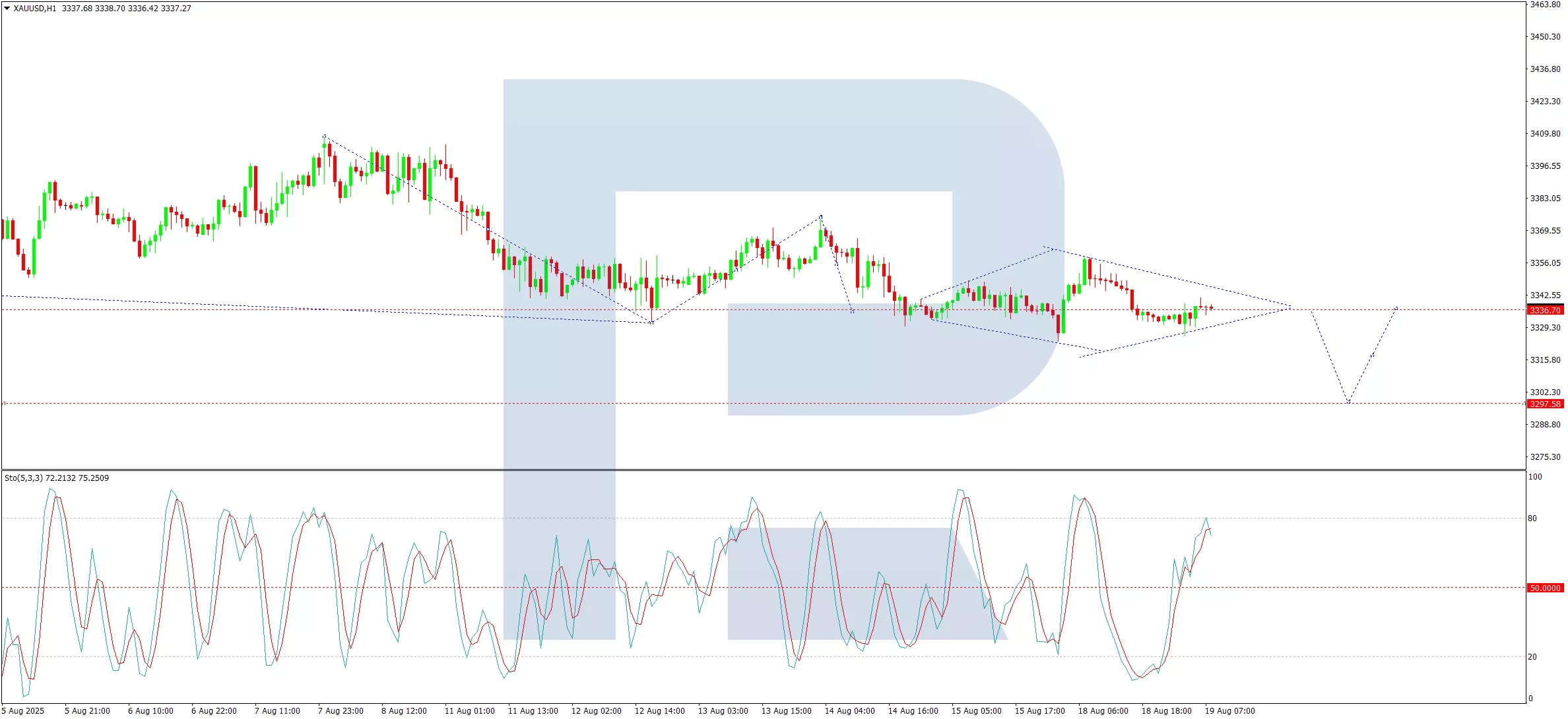 Gold is holding above USD 3,330 as geopolitical tensions and Jackson Hole expectations dominate sentiment. Technical indicators support the development of a downward wave with key targets at 3,296, 3,263, and potentially 3,250, while short-term consolidation remains around the 3,333 level.