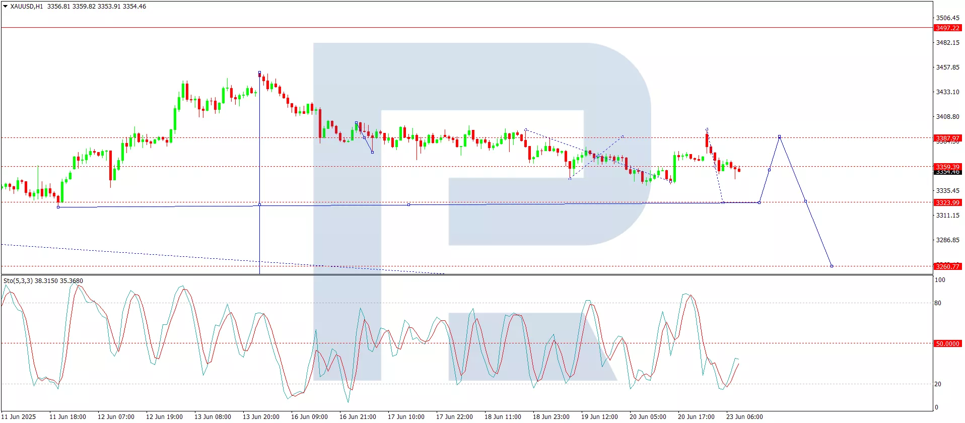 The market completed a corrective wave to 3,396 before reversing in an impulsive move towards 3,359. A consolidation range is now forming around this level, with expectations of a downward breakout towards 3,323 (first target). Upon reaching this level, a potential correction back to 3,388 could follow. The Stochastic oscillator supports this outlook, with its signal line below 50 and trending sharply downward towards 20.
