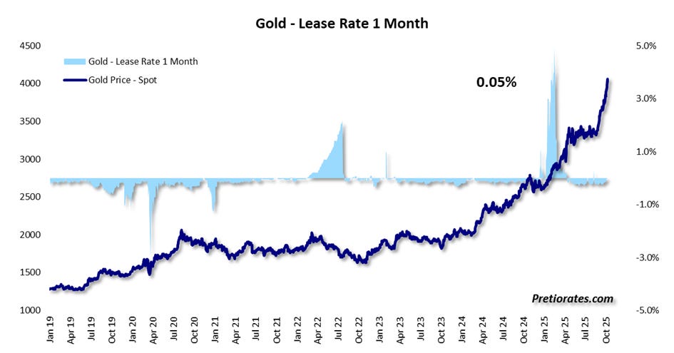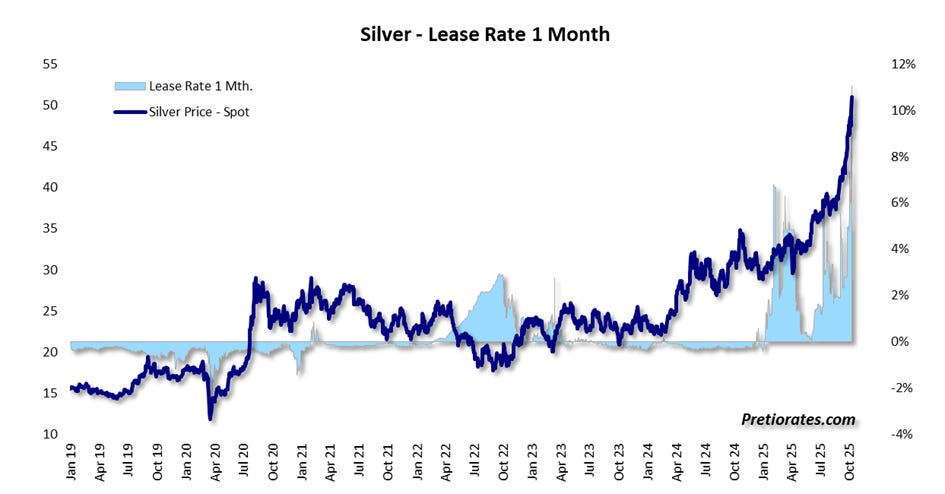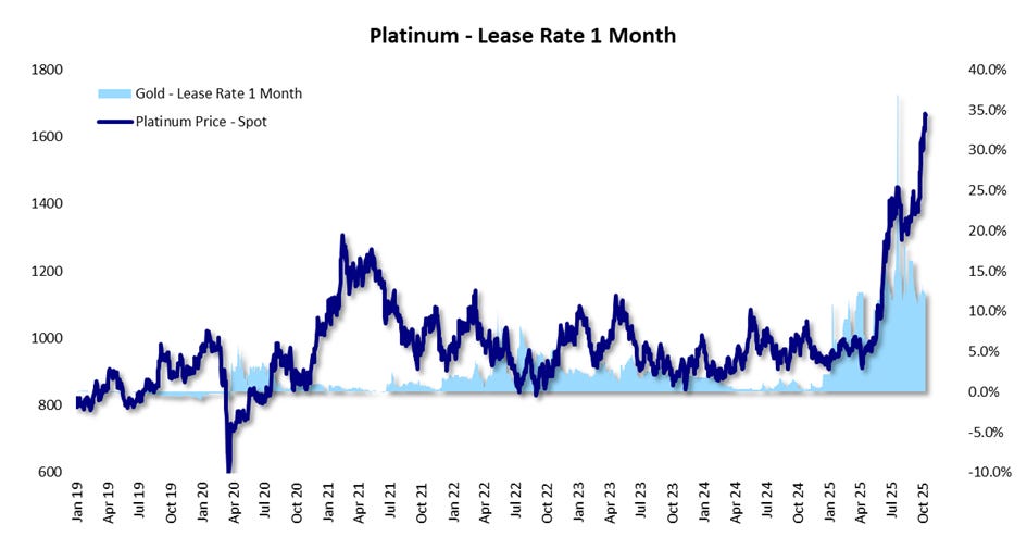 The situation is even more explosive when it comes to platinum. The lease rate temporarily exceeded 35% and currently stands at 12.5%. This is hardly surprising: around 80% of global production comes from Russia and South Africa. Hardly any material is flowing out of Russia, and South African mines are struggling with energy shortages and political turmoil. At the same time, demand from China remains high, as we already explained in May and July 2025.