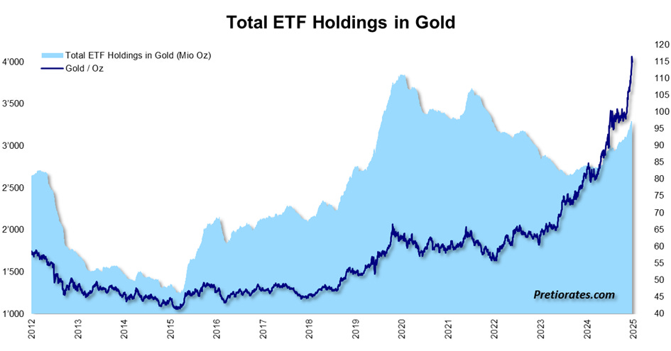 As we described last week, it is now primarily Western investors who are noticeably – or rather, finally – expanding their Gold holdings via ETFs. Nevertheless, Gold exposure in Europe and the US is still below 2020 levels.