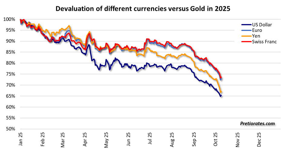 We have explained the pricing of Gold several times. But basically, it reflects the monetary policy of the central bank and the fiscal policy of the government. If these policies are not right, the price of Gold rises relative to the individual currency. But you could also describe it as a devaluation of the individual currency relative to the price of Gold. Many people think of the Venezuelan bolivar or the Turkish lira. But the devaluation of the world’s most important currencies since the beginning of this year is also significant. Unsurprisingly, the US dollar leads the way with a decline of no less than 35%. But the other major currencies have also lost at least 25% against the benchmark Gold...