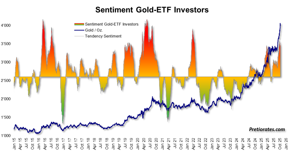 Gold has already gained around 50% in 2025, Silver around 70% and Platinum a good 60%. In fact, the rally in white metals could continue due to physical availability, while the price of Gold could soon enter a period of consolidation. Bullish sentiment in Gold has increased significantly in recent days – although the euphoria is not yet at the level of previous highs, it is getting closer.