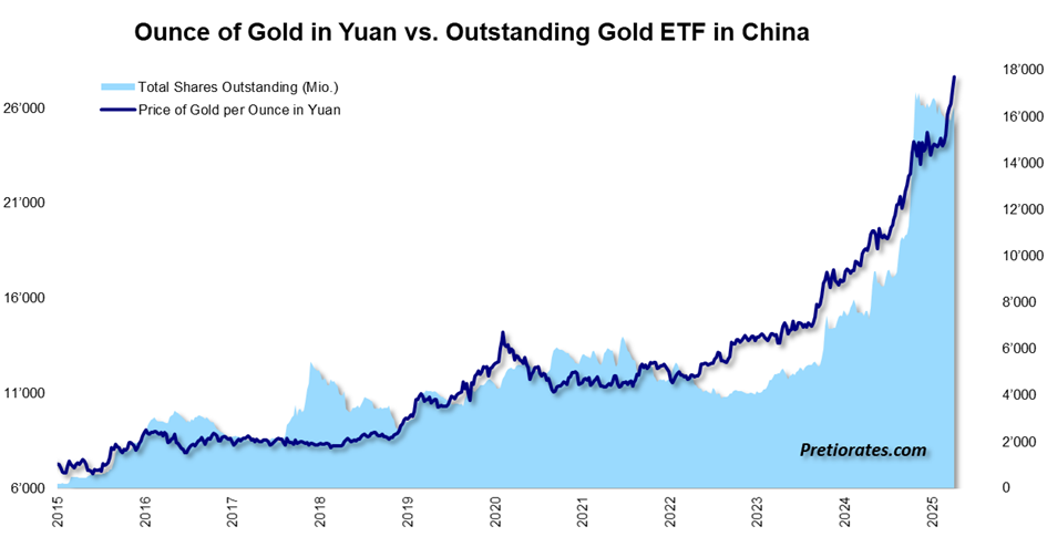 In several issues, we have also pointed out that two centers of power have formed in the global precious metals market: one in Asia, dominated by Shanghai, and one in the West, led by London and New York. In Asia, investors prefer physical Gold – in China and India, mainly in the form of bars and jewelry. In the West, on the other hand, «paper products» or «paper Gold» such as ETFs, certificates, and futures dominate, moving many times the physical volume. Although there are also Gold-backed ETFs in China, the number of outstanding shares has been stagnating for over a year – despite skyrocketing prices.