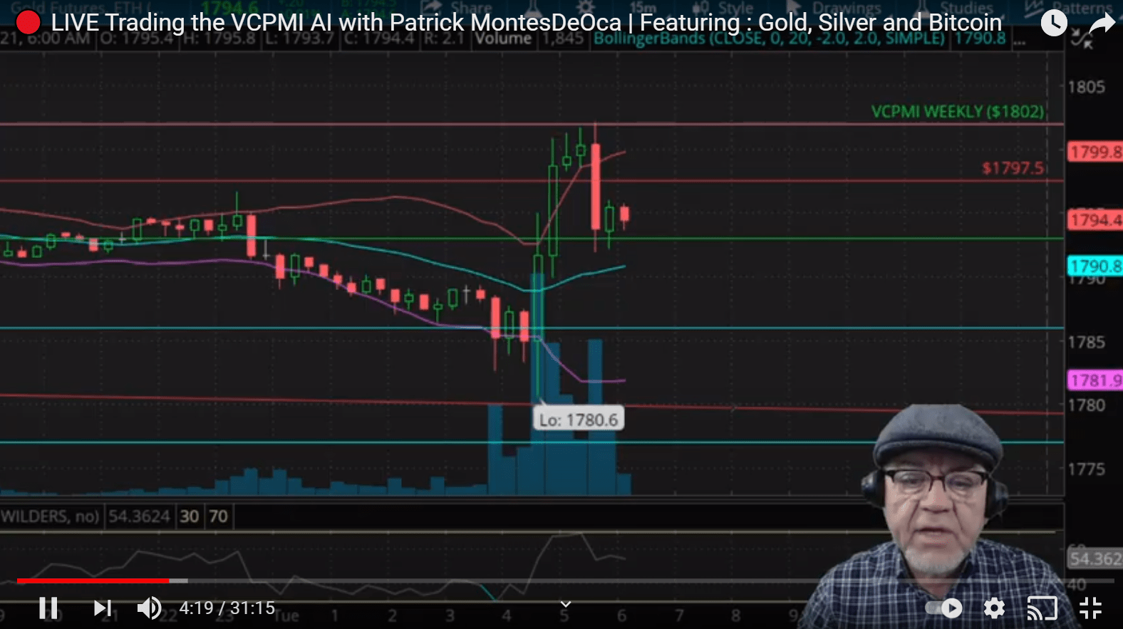 The gold market was choppy today and made a low of $1780.60. It stabbed into the area of support and accumulation of supply, where our AI algorithm, the Variable Changing Price Momentum Indicator (VC PMI), expects buyers to come into the market at these levels. The AI advises not to sell into this area. In fact, there is a 90% to 95% probability that a reversion will occur from these levels. Such a reversion then occurred and we ran back up to the target above the mean of 1802.