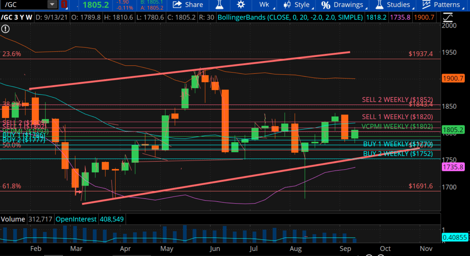The market last week reached $1836, a resistance level, and could not follow through up to $1852, which was the weekly level of resistance. It fell back to $1820, a weekly level, and activated the VC PMI weekly mean of $1802. We are now trading at a support level of $1780 or $1786. We are looking for a major weekly reversal.
