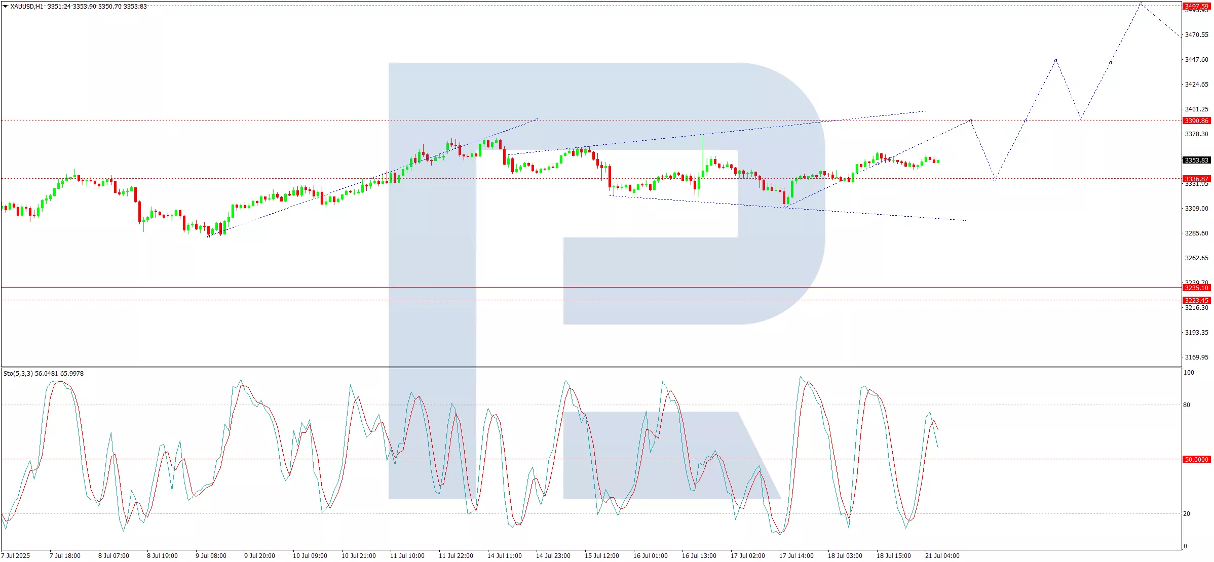 On the H1 chart, XAU/USD is consolidating around $3,333, having briefly declined to $3,310. The current structure suggests a fresh upward wave towards at least $3,390, followed by a retest of $3,333 from above. The Stochastic oscillator supports this scenario, with its signal line above 50 and rising towards 80.