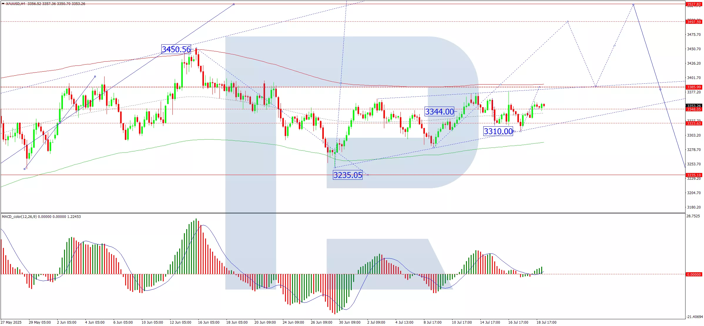 On the H4 chart, XAU/USD is continuing its upward movement towards $3,384. Today, we anticipate the pair will reach this level before undergoing a corrective pullback to $3,333. The market is effectively forming a broad consolidation range around $3,344.