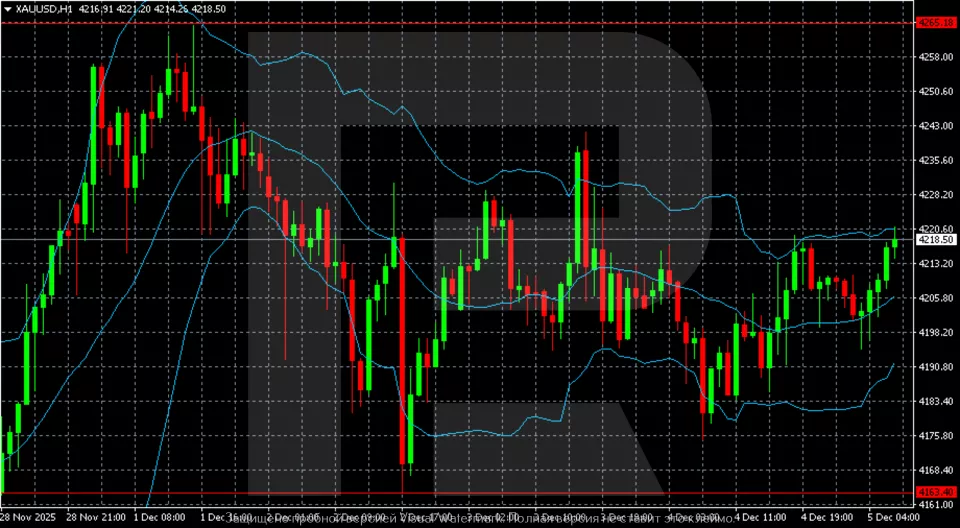 On the H1 chart, XAU/USD is trading within a tightening range between 4,188 USD and 4,220 USD, reflecting mixed short-term momentum. The middle Bollinger Band is providing near-term equilibrium, confirming the absence of a clear directional bias.