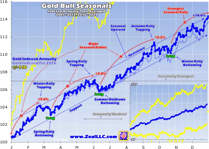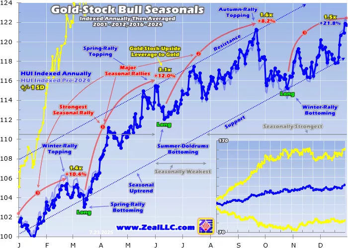 This modern-gold-bull-year average now encompasses fully 21 years, solidifying it with big inertia against change. Yet 2024’s outsized upside gold action proved so remarkable that it still pulled gold seasonals considerably higher. Last year gold soared 27.2%, doubling its prior-20-bull-year average gains of 13.7%!That boosted seasonals from the light-blue line to the dark-blue one, elevating average annual gains to 14.4%.