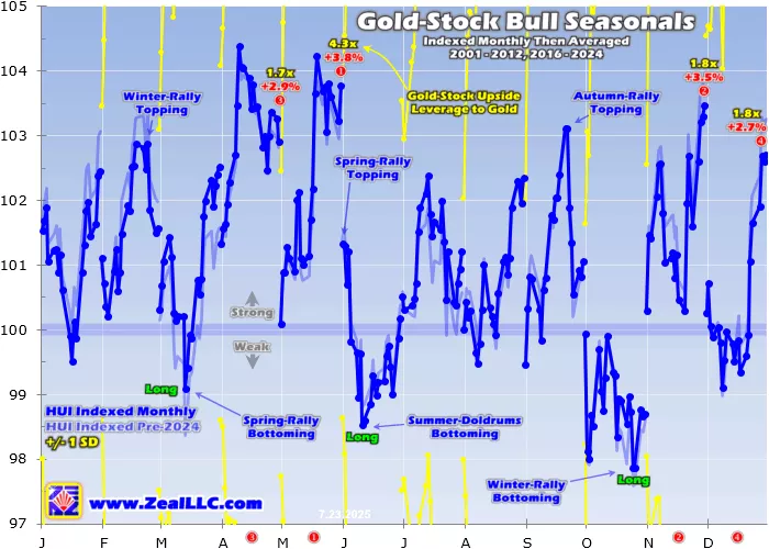 Following the metal which drives their profits, the major gold stocks’ parallel autumn rally also runs from mid-June to late September. During these modern gold-bull years, it has averaged 8.2% gains for 1.6x upside leverage to gold. That has actually proven gold stocks’ weakest seasonal rally, behind spring’s 12.0% and winter’s 10.4%. But this summer of 2025 is already looking considerably different than typical ones.