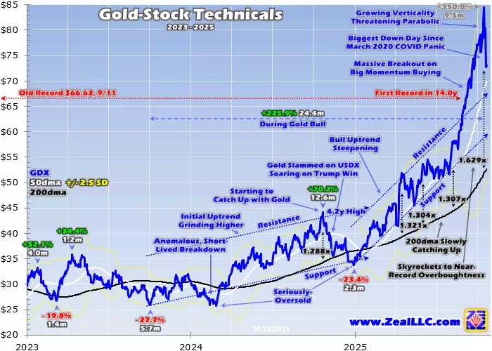 Late last week, the leading GDX gold-stock ETF soared to another dazzling all-time-record-high close of $84.44. GDX had skyrocketed an epic 149.0% year-to-date on a parallel massive 64.5% gold surge!That’s wonderful to see, a magnificent reversal from gold stocks’ dreadful underperformance last year. In 2024 GDX only eked out a 9.4% gain despite gold’s powerful 27.2% rally, for horrendous 0.3x upside leverage.