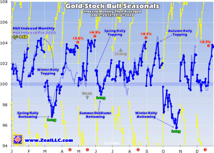 This chart averages the individually-indexed full-year gold performances in those bull-market years from 2001 to 2012 and 2016 to 2020. 2021 isn’t included yet since it remains a work-in-progress. This bull-market-seasonality methodology reveals that gold’s strongest seasonal rally by far is its winter one which tends to start in late October! That portends big gains in coming months from selloff-depressed gold stocks.
