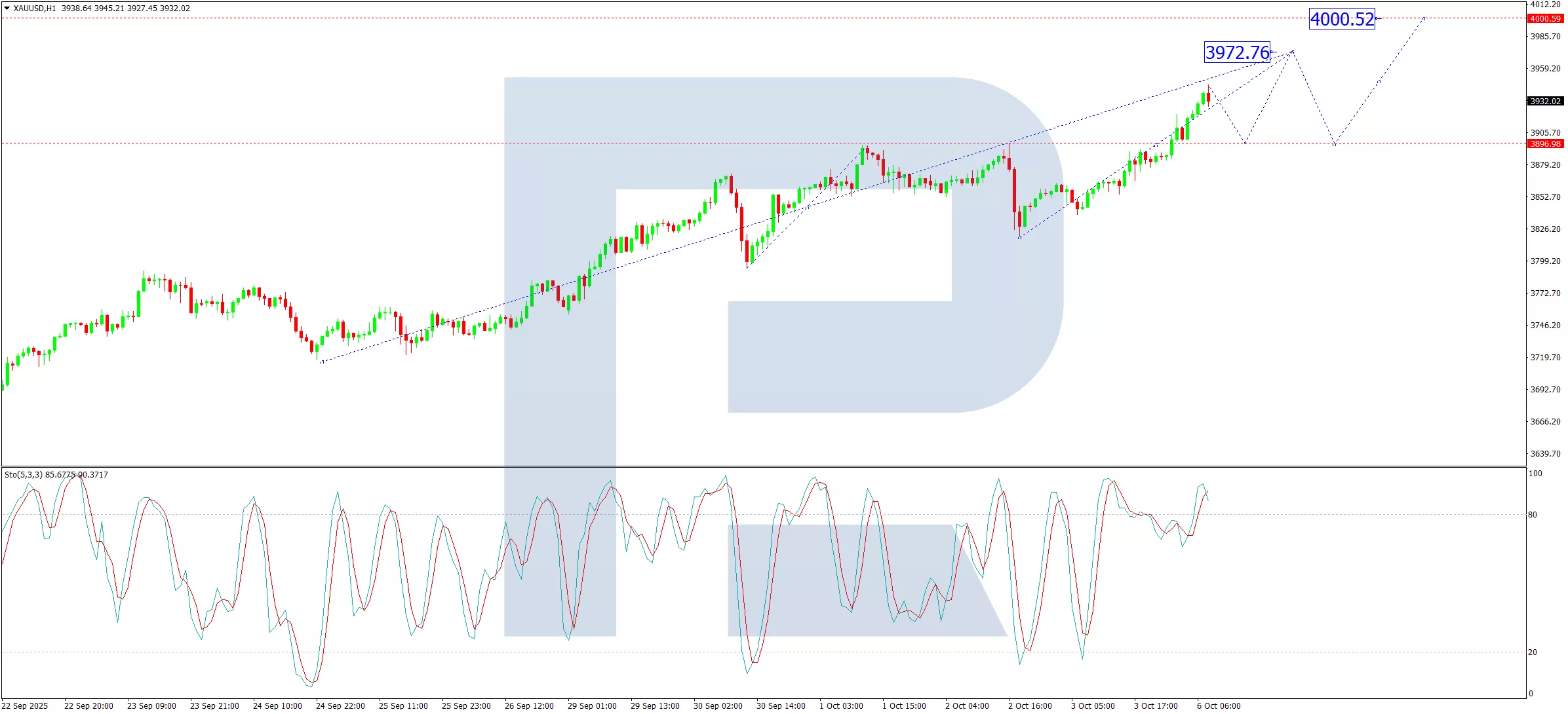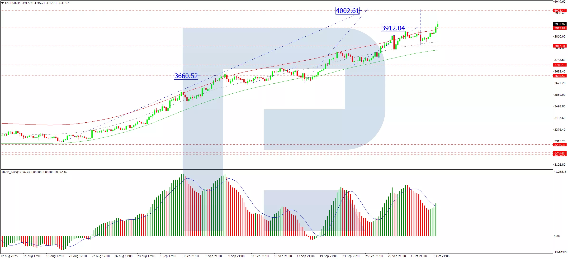 On the H4 chart, XAU/USD found strong support at the 3,820 USD level and is now advancing within a growth wave targeting 4,000 USD. This is considered a local target. Upon reaching it, a corrective pullback towards 3,820 USD is anticipated. Following this correction, the formation of another upward wave targeting 4,170 USD is expected. This bullish outlook is technically confirmed by the MACD indicator, whose signal line is positioned above zero and pointing sharply upward.