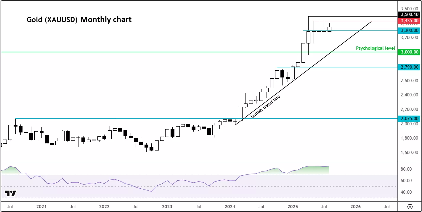 Gold has been on a remarkable run, carving out new highs with only the briefest of pauses along the way. The big question as we head into the second half of the year is whether this upward march has further legs, or if a pullback is finally on the cards. Traders, of course, tend to prefer sticking with the prevailing trend unless there’s a compelling reason to switch tack. Yet, gold’s relentless rise is beginning to raise a few eyebrows, with momentum indicators flashing warnings. We have also seen a few bearish-looking monthly candles, but so far, no downside follow-through: