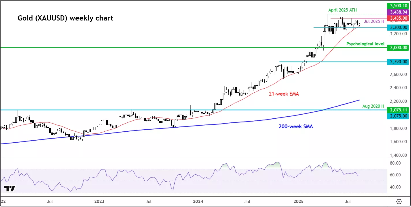 On the weekly chart, things look a touch more forgiving. Since gold’s last record high in April, RSI has eased from the lofty 80 region down to around 63—still high, but less stretched. Importantly, that cooling has come via consolidation rather than a sell-off, which is generally taken as a bullish sign. The RSI, after all, isn’t a sell signal on its own; we’d need to see an actual reversal in price before shifting stance.
