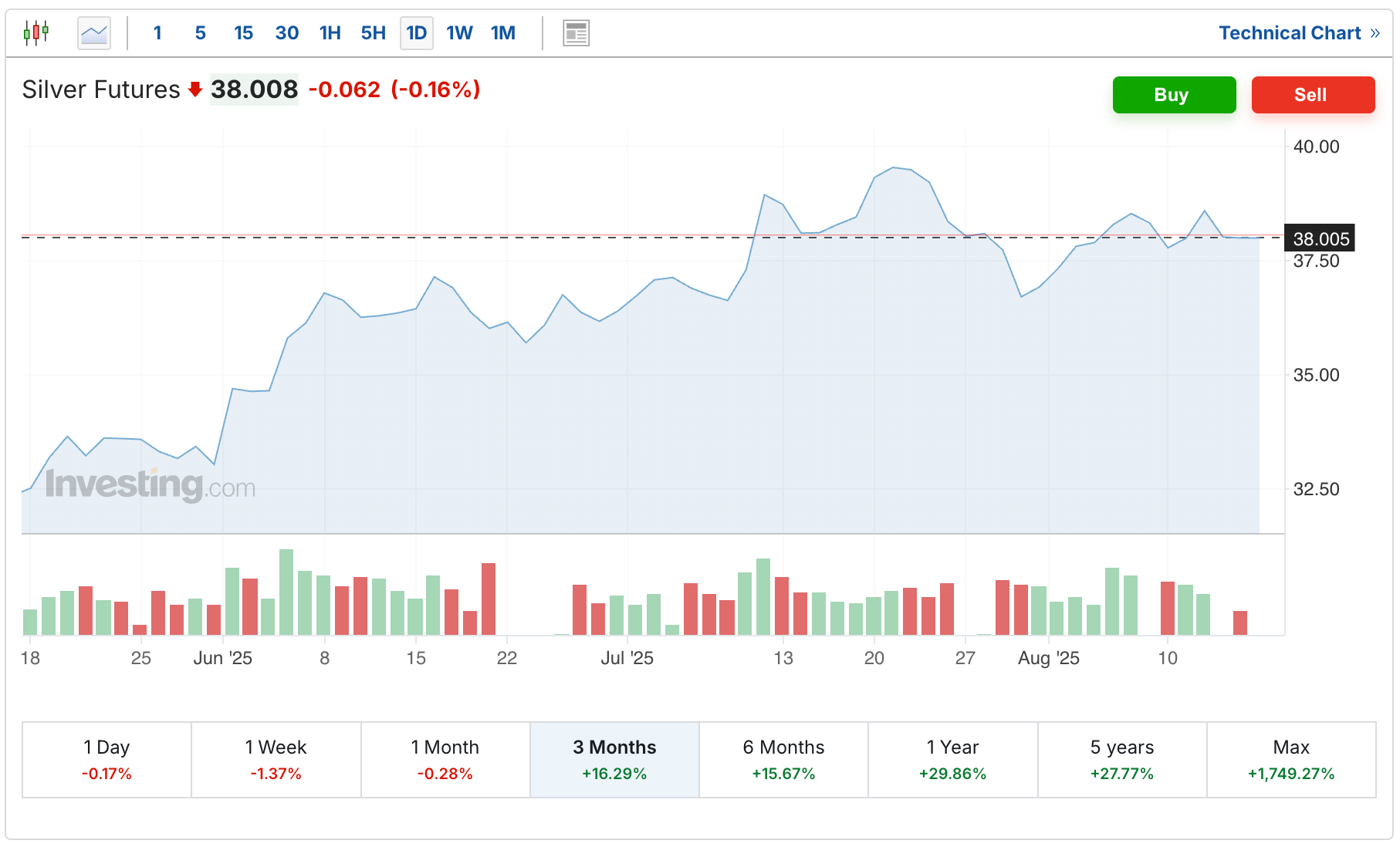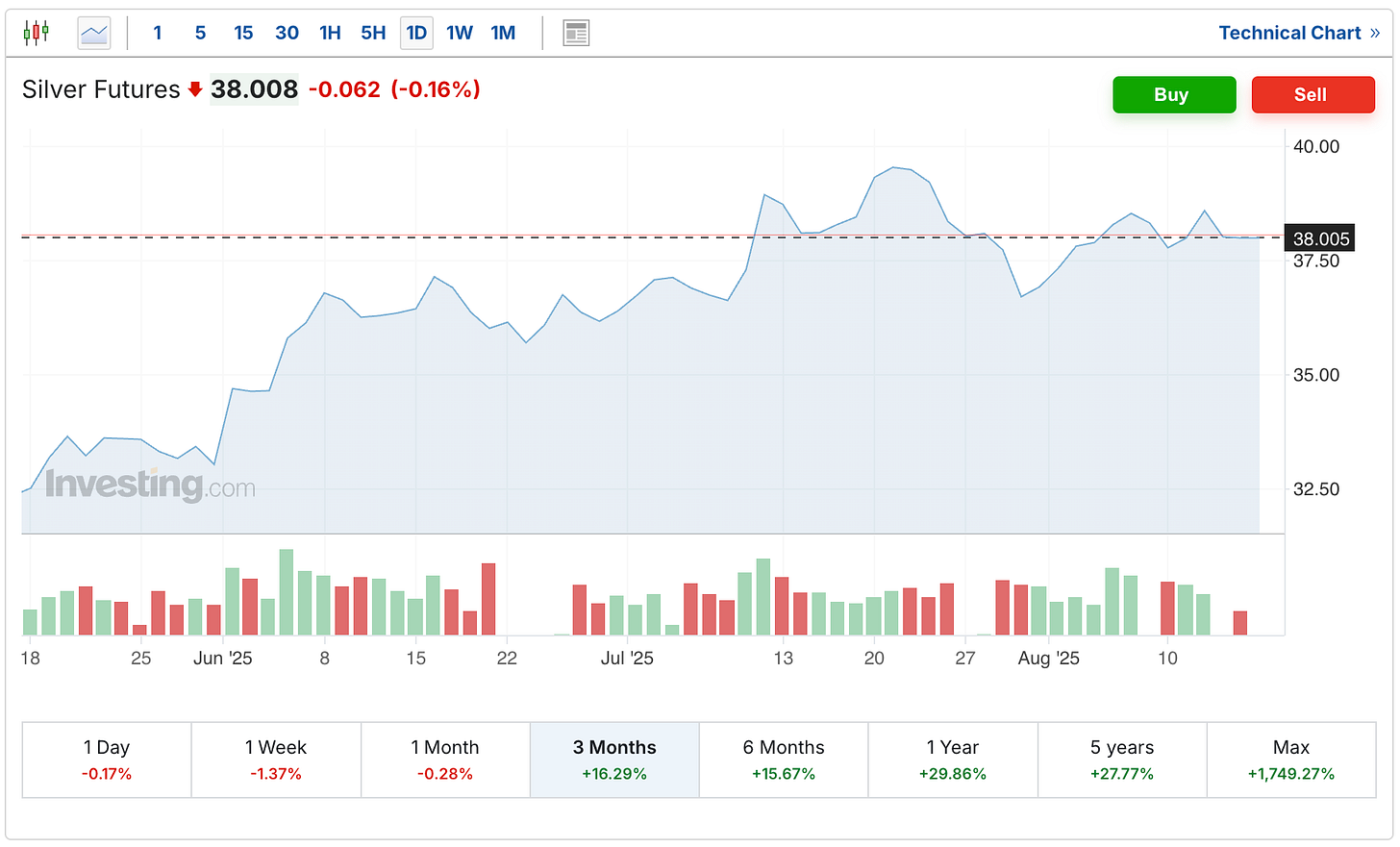 Silver was similarly quiet on Friday, down 6 cents to $38, and you can see how it's also been a couple of months that silver has floated around that $38 level.