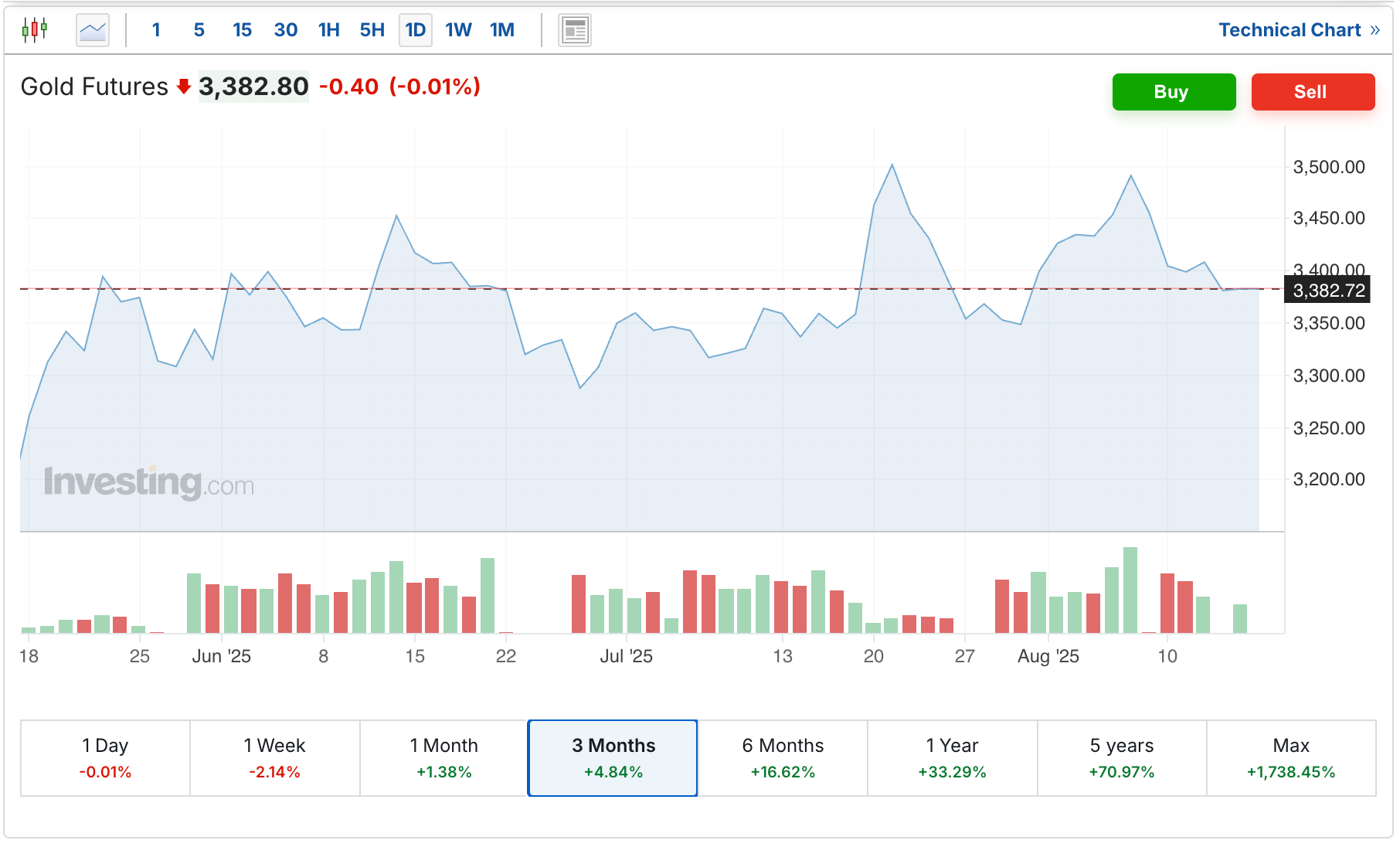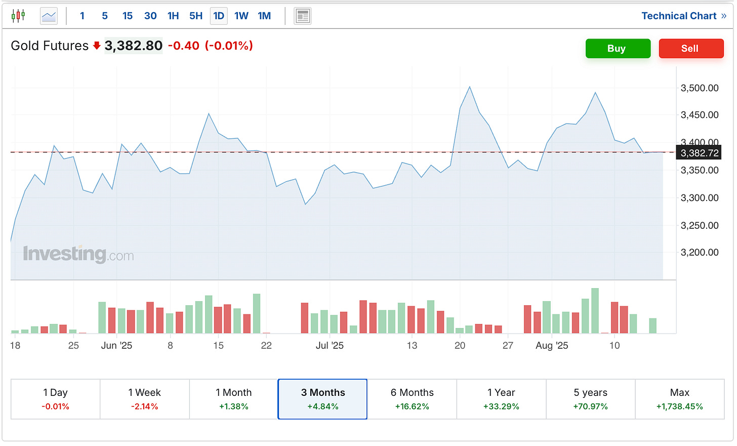 Gold is currently down 40 cents on the day to $3,382. And you can see that it's now been several months, that it's basically been hovering right around that $3,400 level.