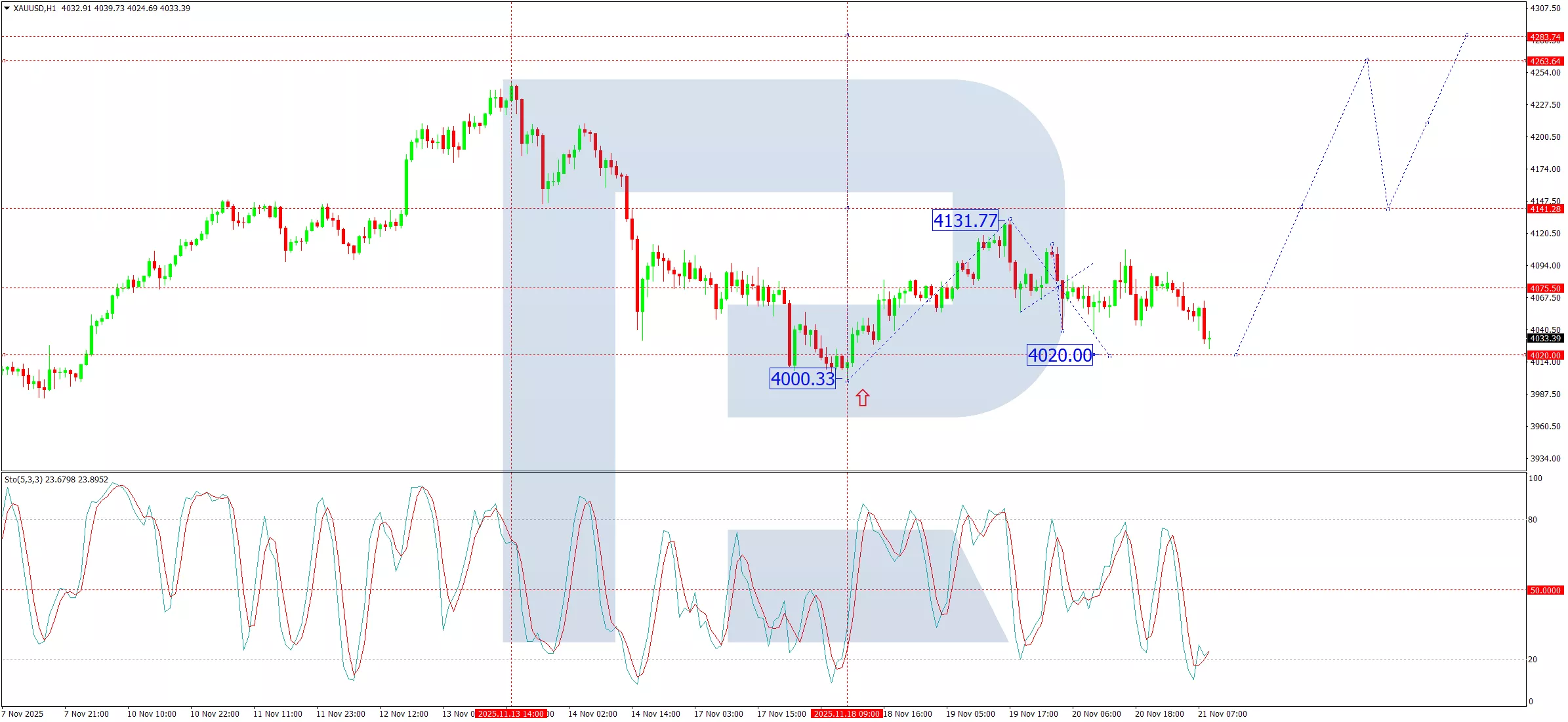 On the H1 chart, the market has established a consolidation range around 4,075 USD. A downward wave is expected to develop toward at least 4,020 USD, which would complete the first phase of a larger pattern. This would be followed by a growth wave toward 4,131 USD, a correction back toward 4,020 USD, and then a final advance targeting 4,263 USD. The Stochastic oscillator aligns with this outlook, with its signal line at 20 and beginning to turn upward, suggesting potential for a near-term bounce.